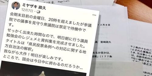 宮崎政久 (自民系衆院議員) の作成資料、県民投票「否決」への道筋、勉強会で配布 (沖縄タイムス) ➊「法の下の平等」が理解できない宮崎氏、ほんとうに弁護士なのか ➋ 4度落選するも4度比例復活し沖縄に送りこまれる自民の議員 ➌ ボギー手登根や我那覇真子…