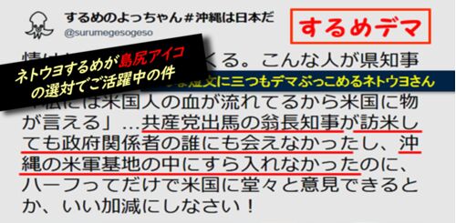 1ツイートにデマ3連発の名物「スルメのよっちゃん」 ① デマで有名「するめのよっちゃん」とは デマ① 共産党出馬の翁長知事デマ デマ② 訪米先で政府関係者の誰にも会えなかったデマ デマ③ 翁長知事は米軍基地の中に入れなかったデマ ② デマの「するめのよっ…