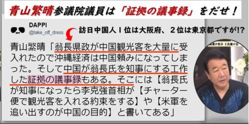 デマまとめサイト Share News Japan から再びの「証拠の議事録もある」発言 青山デマ❶&➐「翁長県政が中国観光客を大量に受入れたので沖縄経済は中国頼みに」「中国の観光客受け入れて、乗っ取られた状態に」!? 青山デマ❺「中国のテコ入れで工作員込みの観光…